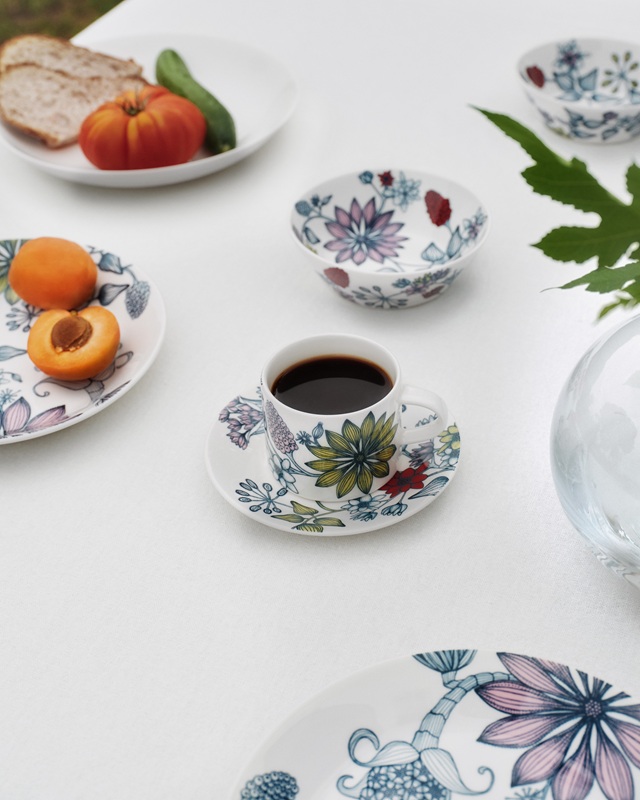 器の表⾯全体に装飾が広がる表現は、⽇常の器に芸術的な装飾を取り⼊れてきたアラビアの豊かな伝統を体現しています。モチーフとなった植物や花、花房、蕾などはすべて、デザイナー ヘイニ・リータフフタの想像⼒から⽣まれたもので、1 つの花の中に複数の植物の特徴が取り⼊れられるなど、有機的で初夏の⽣命を感じさせるデザインとなっています。